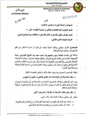 طبقا لتوجيهات وتعليمات رئيس الجمهورية الواردة في خطابه بتاريخ 8 نوفمبر 2025 بانبيكت لحواش، وجه الوزير الأول المختار ولد اجاي، أعضاء الحكومة بالالتزام بحظر المشاركة في الاجتماعات ذات الطابع الطائفي أو القبلي أو الجهوي، والانسحاب فورا من أي اجتماع ظهرت محاولة استغلاله كمنصة لذلك.